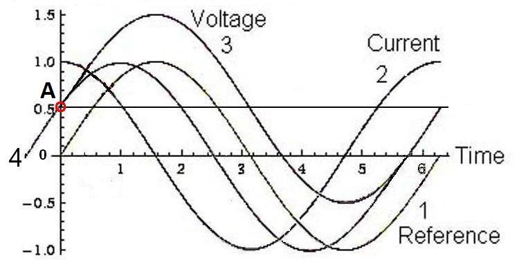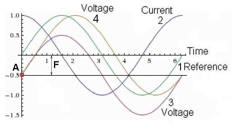rms no-offset voltage and current values by the cosine of a phase-shift